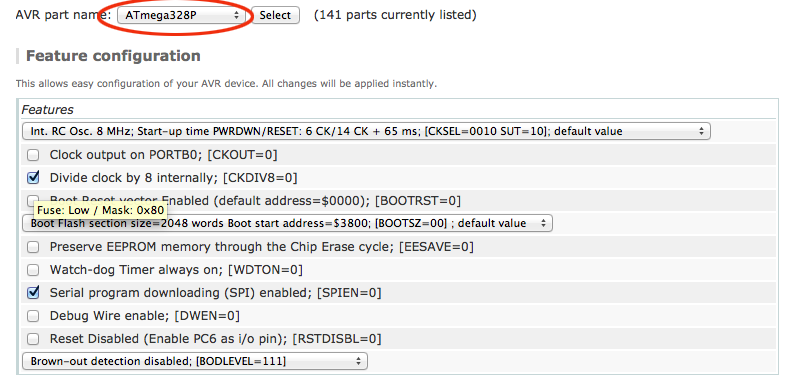 Select the correct processor, and then you can type in the hex codes for the fuses and see what they mean. Type in hex values: