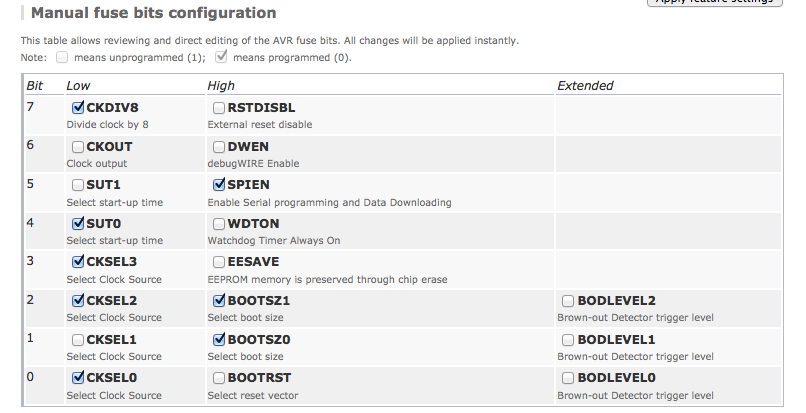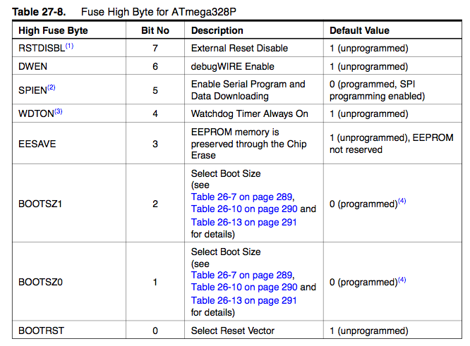 Warning: Hopefully I have made it clear above, that if you set a fuse wrongly, you can "brick" your processor, at least unless you have a high-voltage programming board handy, in order to recover from doing things like turning off ICSP programming.