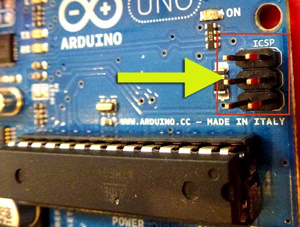 The next thing is to use ICSP programming by plugging a cable into the ICSP "header" (pins) on your Arduino. This header is usually labelled ICSP, like this: