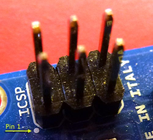 The ICSP header should have a dot indicating pin 1, like this: