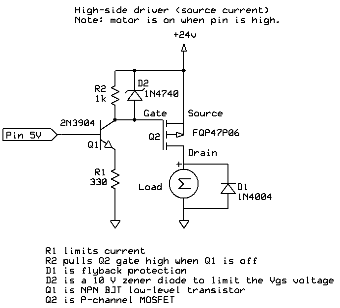 This circuit is similar to the "low side" MOSFET driver described above. The emitter of the transistor is connected to Ground, so it "sinks" current. The transistor is an NPN transistor. A similar and common part would be the BC546/547/548 transistors.