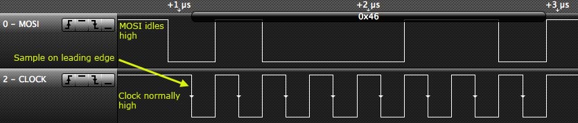 - Mode 1 - clock is normally low (CPOL = 0), and the data is sampled on the transition from high to low (trailing edge) (CPHA = 1)