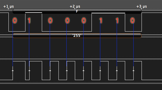 Let's start with an image - this is a screenshot taken with a logic analyser. It shows the 3-character sequence "Fab" being sent from the Arduino.