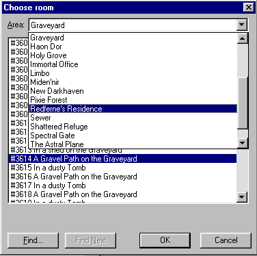 To make things easier, you can load the other area (open it with the Area Editor), or open all areas (use Ctrl+L to open your Area List file). Once you have done that you can use the drop-down box to choose an area from the list, and then all rooms in that area will be displayed. Simply pick one. See image: