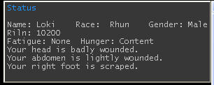 With tutorial #2 I was able to figure out a way to get all the damage from the status screen to display in the top right corner by having it copy anything with "Your *" in front of it. But it seems to use some form of multi-line triggers in the match loop and thus I was unable to omit the status screen from appearing (like it was moved to the new window) and I was unable to get the "Riln:", "Fatigue:" and "Hunger:" sections to appear.