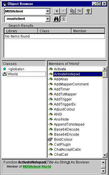 - Open the Object Browser (F2) or use the View Menu -> Object Browser, and change the top combo-box to "MUSHclient". You will see "World" appear in the list of classes down the bottom of that window. Double-click on World and you will see all the supported world functions (eg. AddAlias, AddTimer and so on). Close the browser.