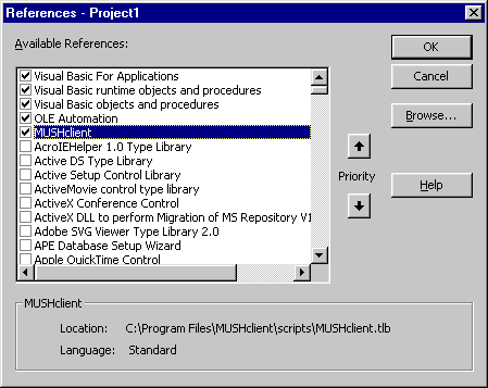 As for the .tlb file, I doubt you can use it in a script, it is for if you are writing a program in full Visual Basic. In that case it isn't necessary, just helpful. Here is an example. If you start up VB and open a new project, and then go to the Project menu > References, you can click the Browse button, and use that to add the mushclient.tlb file. After you do that you should see something like this: