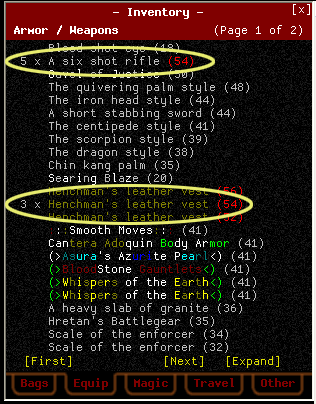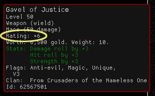 | Hidden away in the plugin is an idea I was working on - a "rating" for weapons. See below, the rating is circled. This is calculated based on the "standard" damage a weapon of a certain level does, and indicates if this weapon does more or less than the standard damage. It is intended to see if the weapon is "better" than another one, for its level.