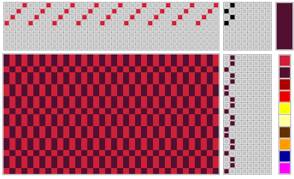 If you are using a lot of similar colours, it may not be obvious which colour in the colour palette corresponds to a colour in the warp or weft. To find this out, click on a square in the calculated pattern area (as in the example below). While you are holding down the mouse button, a line will appear to the right of the colour in the colour palette which represents which colour appears in that square.